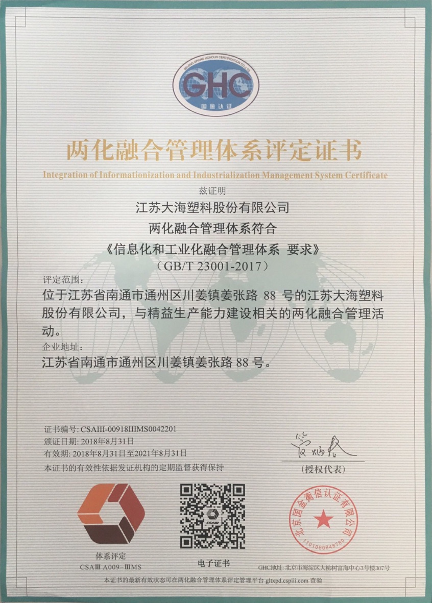 公司获两化融合管理体系评定证书继6月份公司两化融合管理体系外审及公示之后,8月底,公司收到了由北京国金衡信认证有限公司发出的两化融合管理体系评定证书,标志着公司的两化融合管理体系正式通过了贯标。 注:两化融合管理体系贯标:是根据GB/T 23001-2017《信息化和工业化融合管理体系要求》国家标准,建立企业的两化融合管理体系并持续运行。 两化融合管理体系:是企业系统地建立、实施、保持和改进两化融合过程管理机制的通用方法,覆盖企业全局,可帮助企业依据为实现自身战略目标所提出的需求,规定两化融合相关过程,并使其持续受控,以形成获取可持续竞争优势所要求的信息化环境下的新型能力。